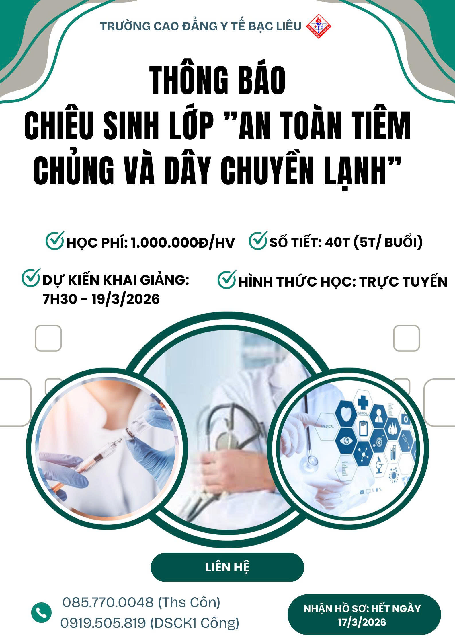 Nhằm nâng cao năng lực chuyên môn cho đội ngũ nhân viên y tế trong công tác tiêm chủng an toàn và quản lý dây chuyền lạnh vắc xin, Trường Cao đẳng Y tế Bạc Liêu thông báo chiêu sinh lớp đào tạo “An toàn tiêm chủng và dây chuyền lạnh” với các thông tin cụ thể như sau: