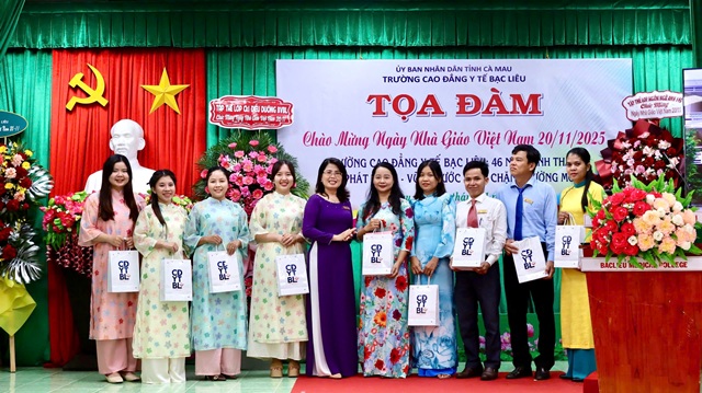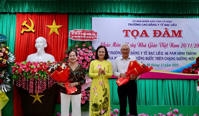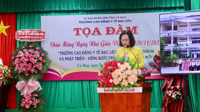 Nguyên Phó Bí thư Thường trực Tỉnh uỷ Lê Thị Ái Nam tặng hoa chúc mừng các thế hệ thầy cô Trường CĐYT Bạc Liêu nhân Ngày Nhà giáo Việt Nam 20/11.